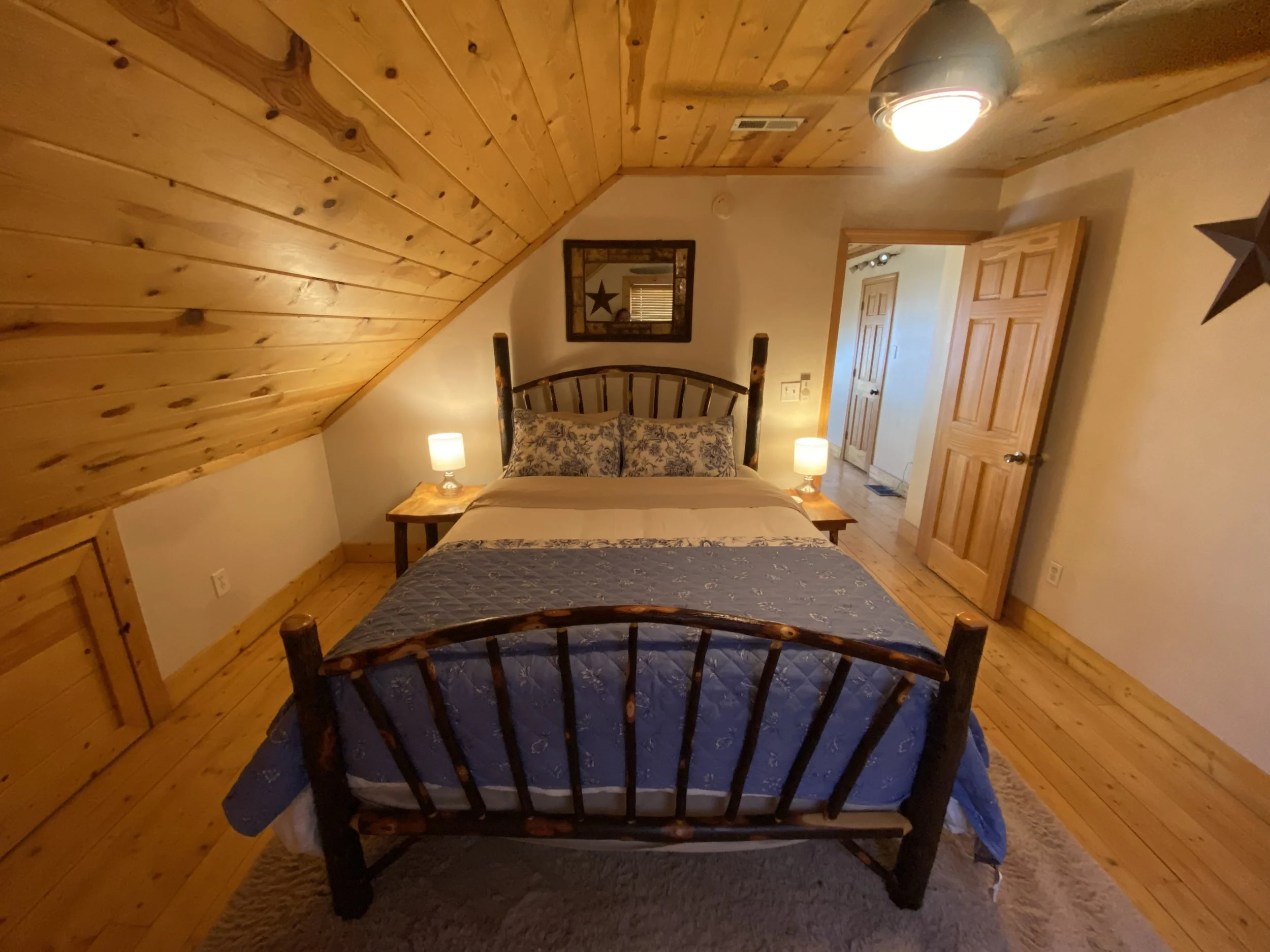 - Main-level master suite with king bed, full bathroom (shared access available)